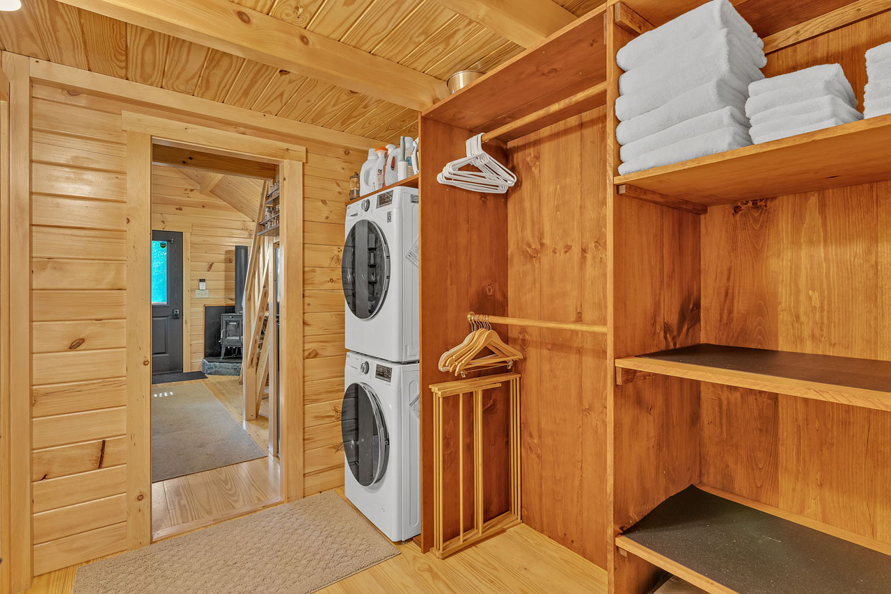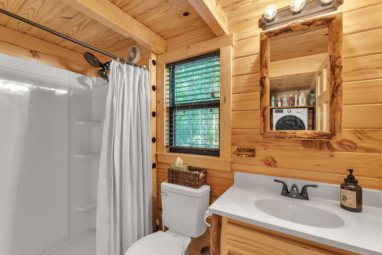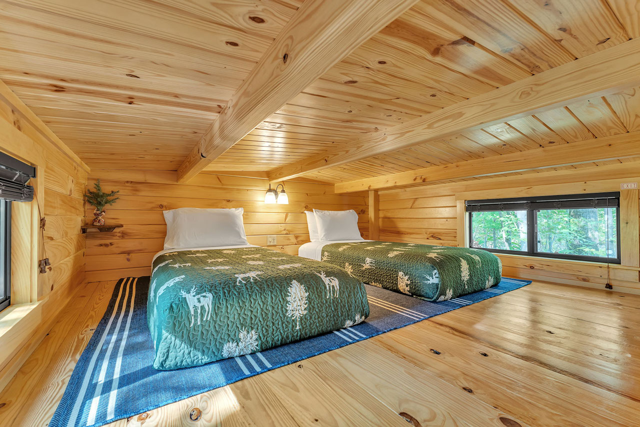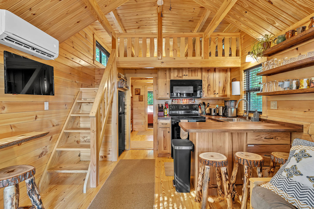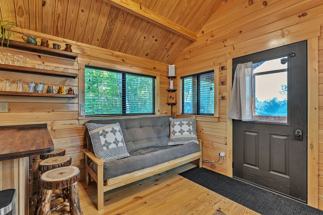 This classic “tiny home” features master bedroom with 1 queen bed, sleeping loft with 2 twin beds, living room with 1 double futon, fully stocked kitchen, bathroom with stall shower & washer/dryer. 6 person maximum due to system ratings. Dog friendly (2 pet maximum) for an additional fee. Please note that breakfast is not included with the cabin.